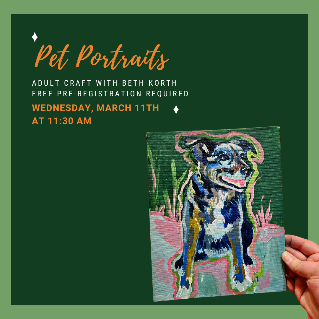 Free Pet Portrait craft with Beth Korth from Tippet Rise. Please bring a color printout (8.5×11) of your pet or animal of choosing. This printout will be ruined in the art process, so please use photo paper or lighter. Prior to the event, all registered attendees may make one photocopy or colored print of their pet or animal of choosing for free at the library. You can email your photo to slibrary@stillwatercountylibrary.org to be printed.