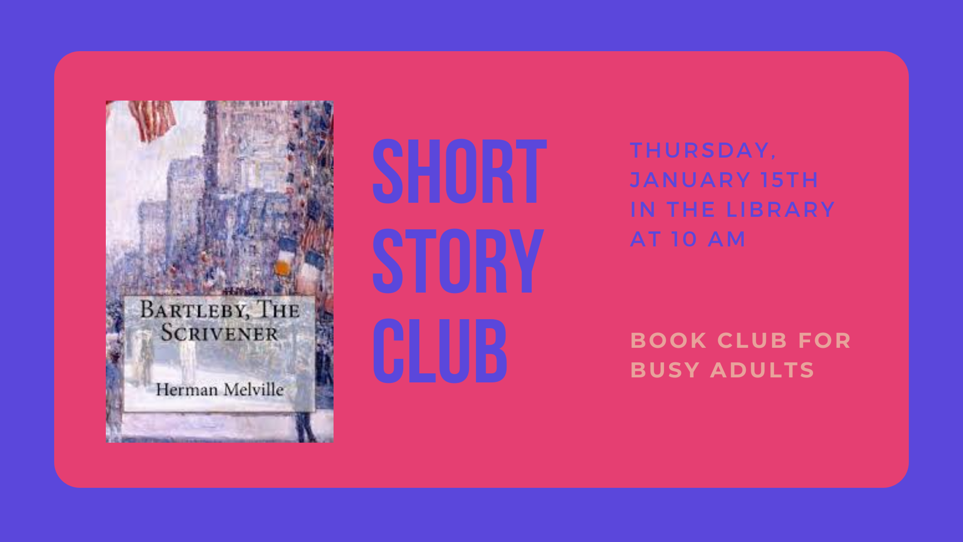 A book club for adults, but with a short story because sometimes there isn’t enough time to read an entire book. We will discuss “Bartleby, The Scrivener” by Herman Melville. Explore capitalism, alienation, and the human condition.
