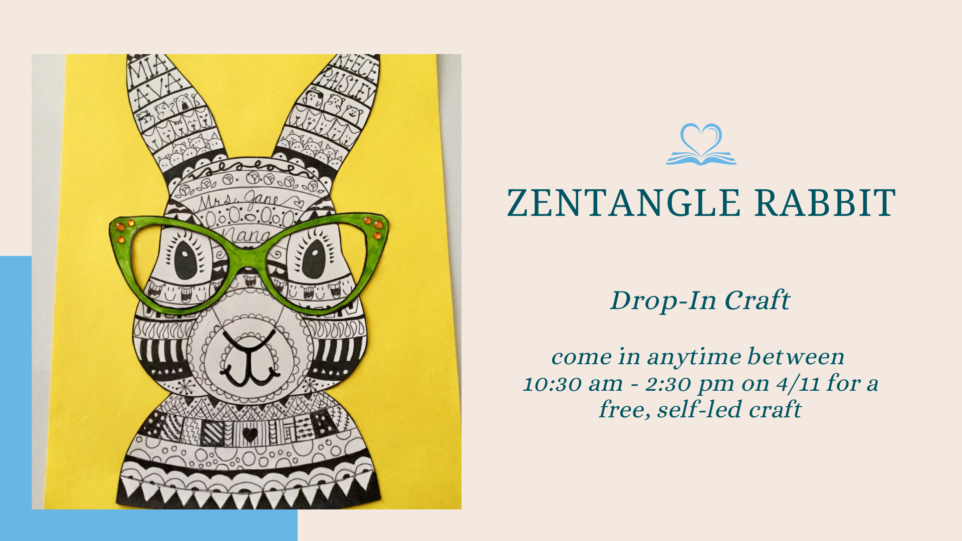 Come in anytime for a self-led Zentangle rabbit craft. Zentangle is an easy-to-learn art form that uses repetitive patterns to create intricate images. All materials and instructions will be provided.